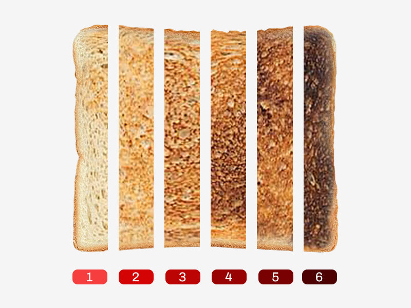 The toasters offers a full range of browning options to allow perfect customization of any piece of bread from light to dark: Settings 1-2 (70s - 100s): Light toast shade