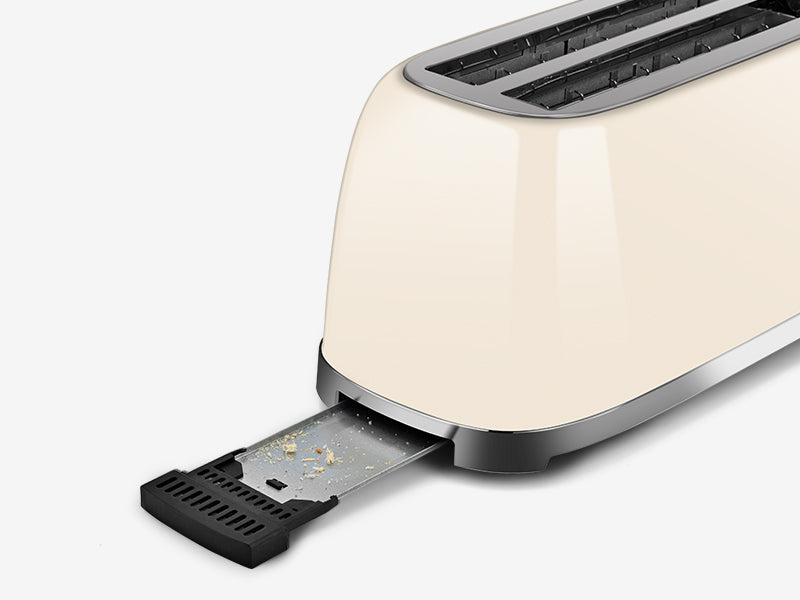 The slide-out crumb tray located behind the toaster can be effortlessly removed for cleaning.